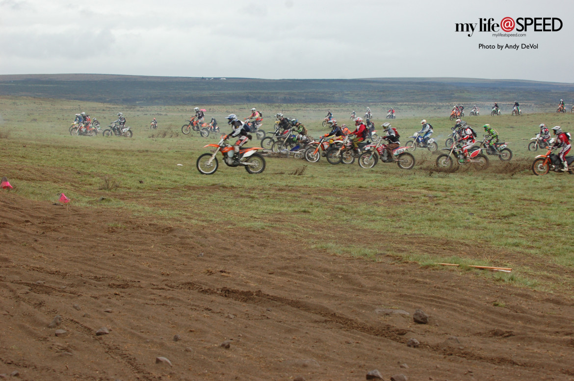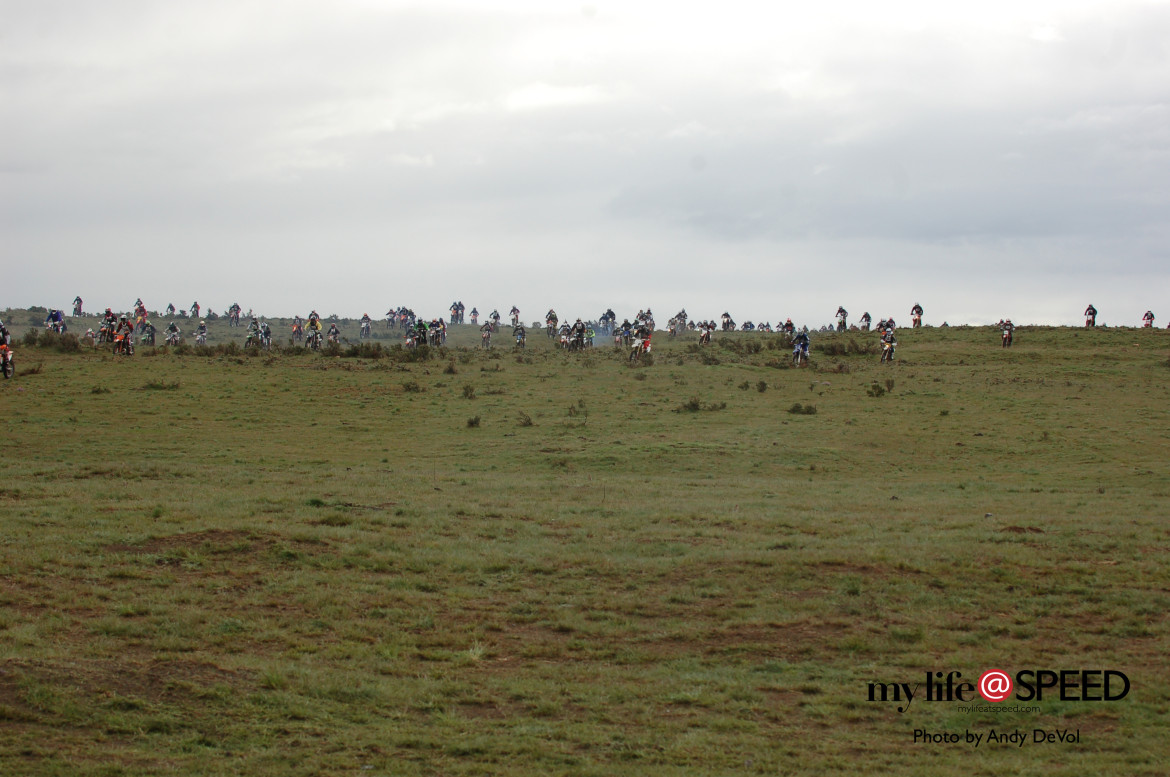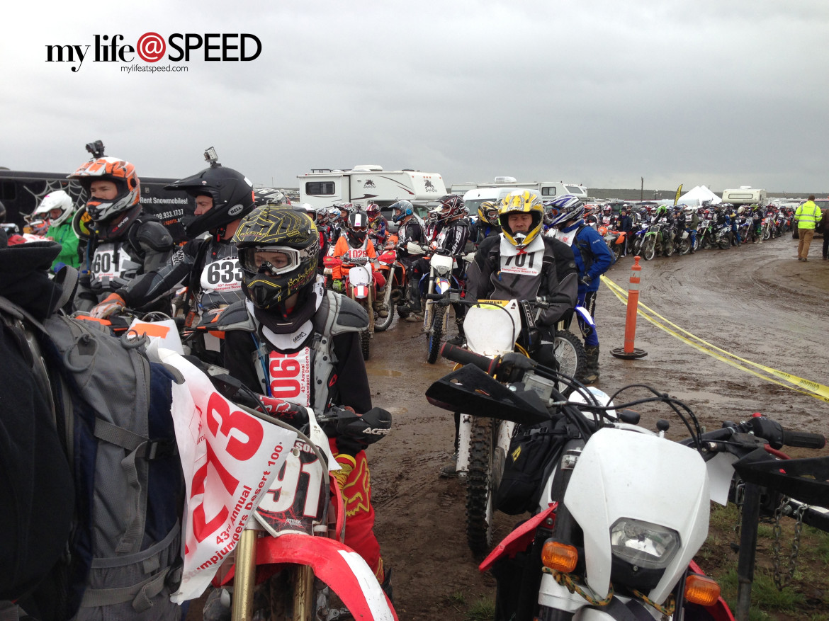 Okay race fans, I can say that with all the preparation and conversations about what I heard about the LeMans style start of the 40 year old Desert 100, I honestly could not prepare for what I would witness. The dust of days earlier had turned into slick mud after rain had hit the farmlands or “race course” late on Saturday through Sunday. Now, thousands of motorcycles were heading down two dirt roads which would converge into one…and they were muddy and slick.