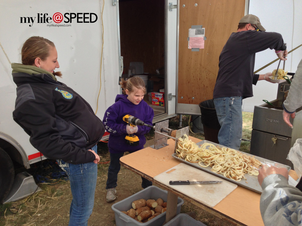 Of course, in Desert 100 fashion, exploration quickly led us to the beer garden and hunger led us to the food court – which led to the BEST curley fries, perfectly paired with a beer from Odessa local brewery, Rocky Coulee Brewing Company. Even the way the fries were prepared was awesome!! Here is the little girl with a HUGE drill equipped with a specialty bit made to make, you guessed it – curley fries. The foodie in me was happy and my thirst quenched. Ahhh…life doesn’t get much better!!