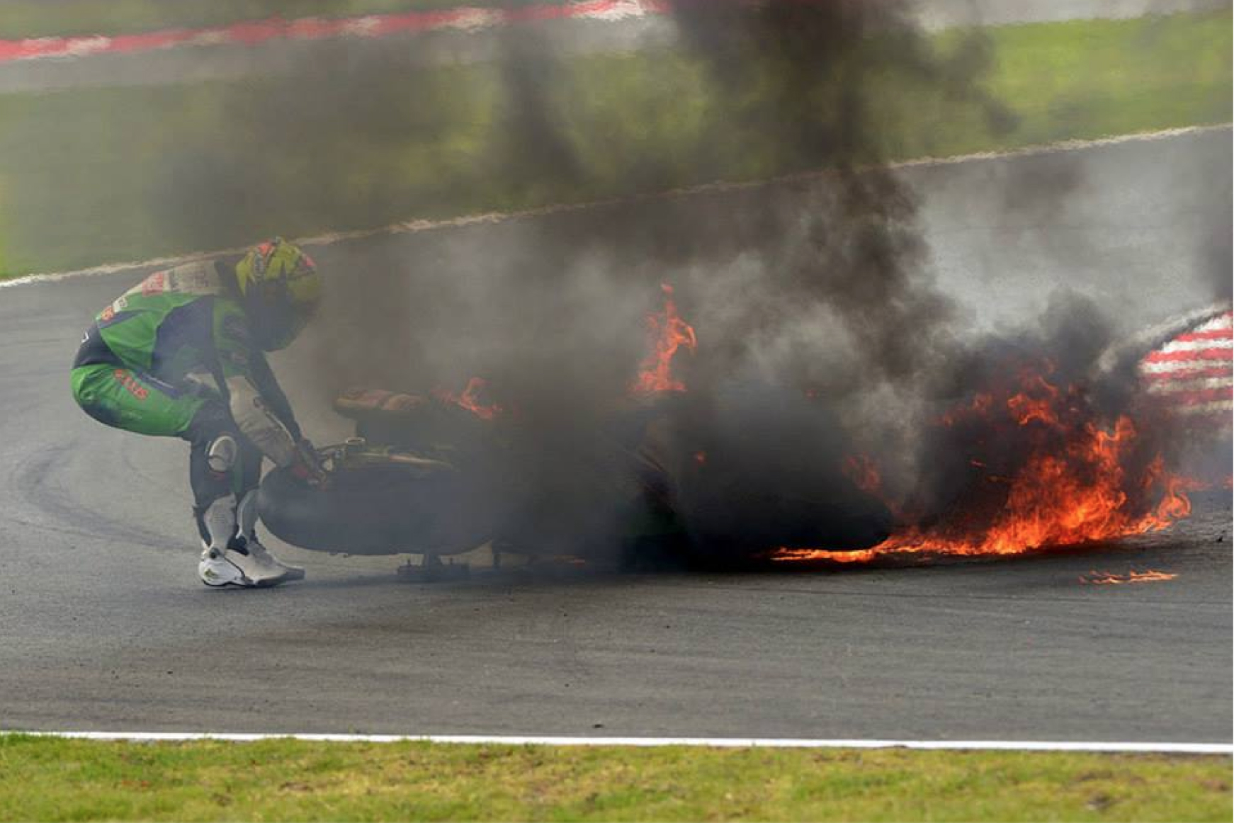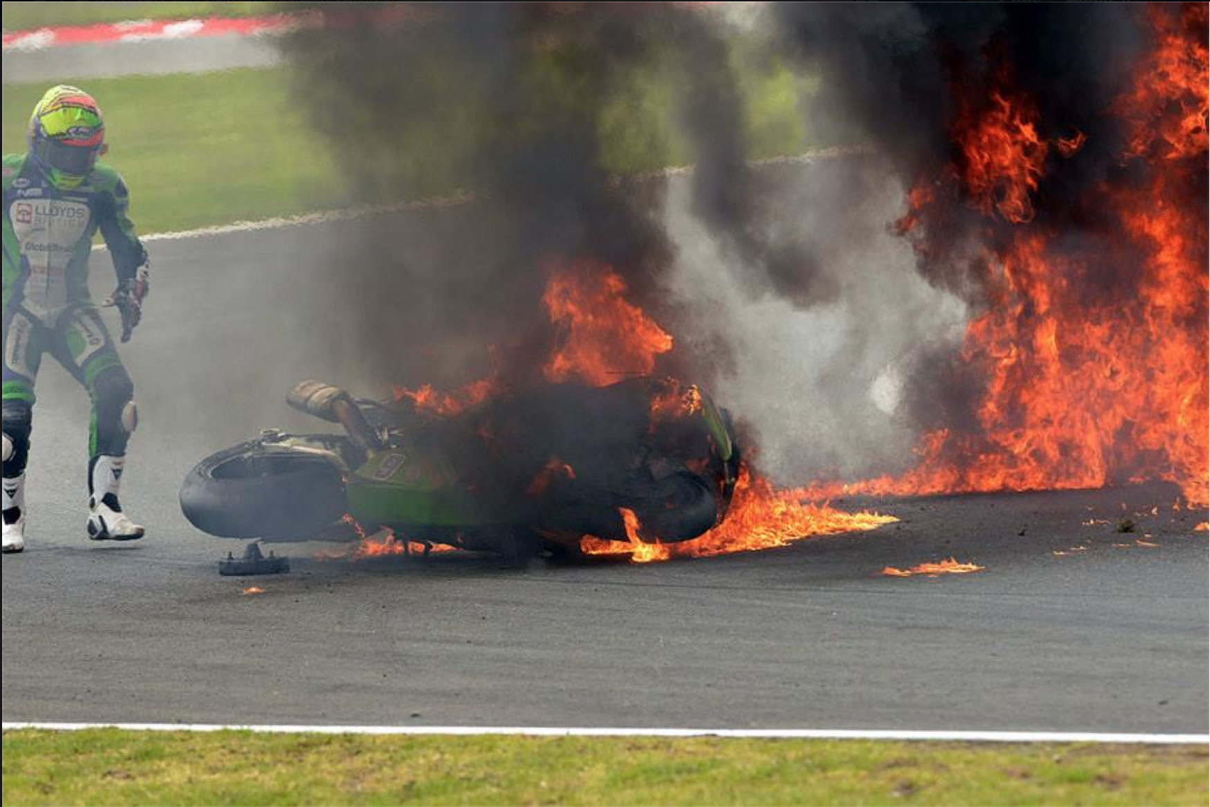 Walker, who bounced away from the crash unhurt, attempted to pull the burning bike out of the pool of fire, before marshals with fire extinguishers were able to quench the flames.