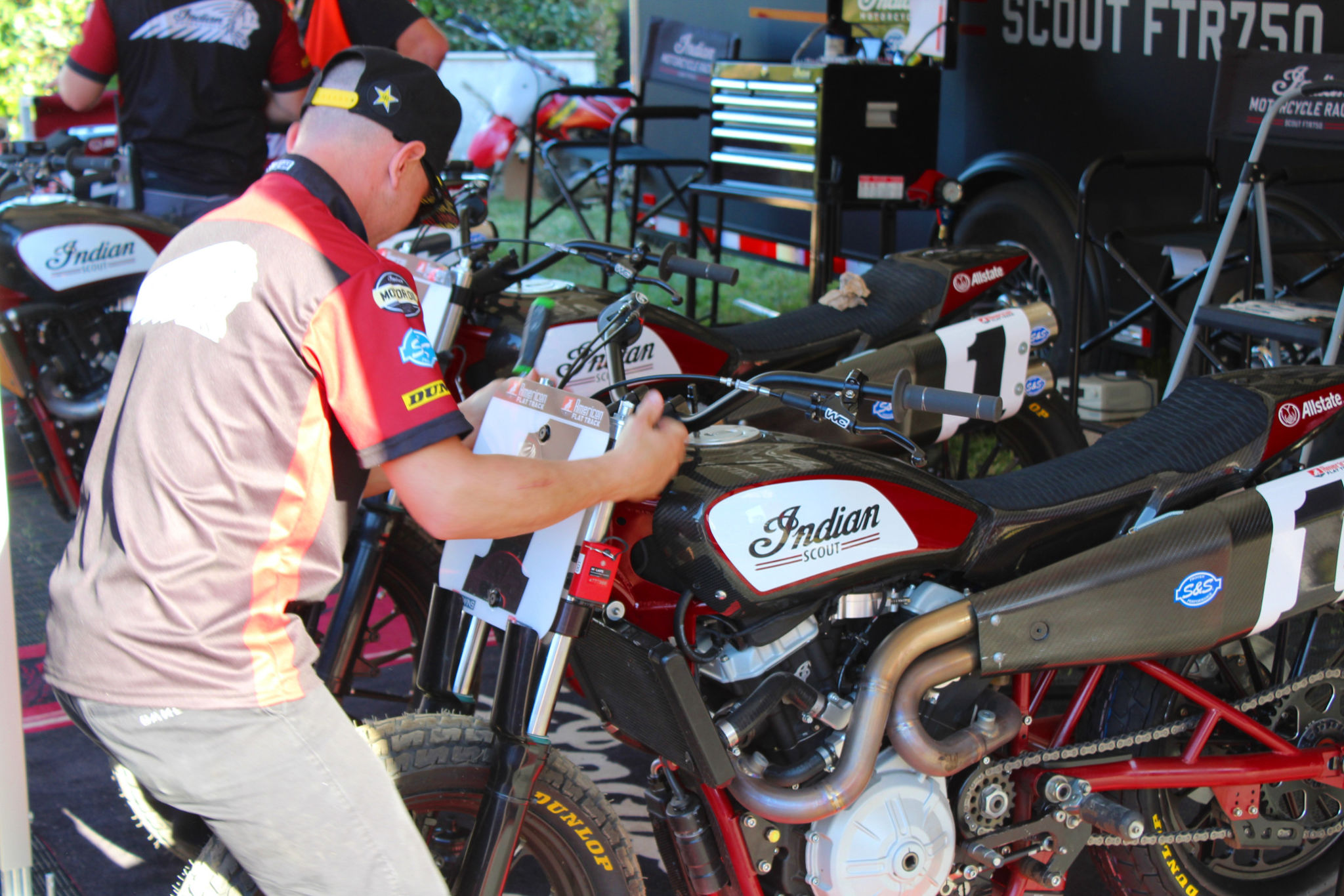 After decades of carburetors, seeing Harley mechanics troubleshoot a running racebike by looking into a laptop will take some getting used to. Here, Jake Johnson’s #5 XG750R is being tended to after developing a misfire during the semi-final. Photo: Johnny Killmore.